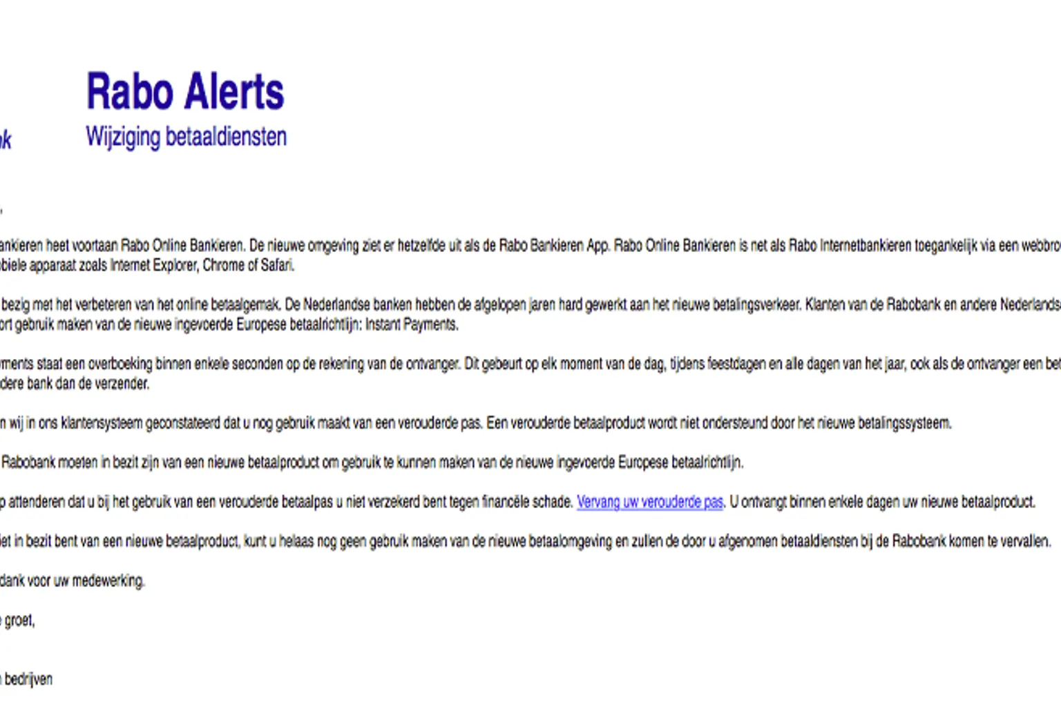 'Rabo Internetbankieren heet voortaan 'Rabo Online Bankieren' Zo begint deze phishingmail. Er is geconstateerd dat je nog gebruik maakt van een 'verouderde' bankpas. Met deze pas ben je niet verzekerd tegen financiële schade. Dus je moet je oude bankpas vervangen. Trap niet in deze truc! De e-mail is nep.