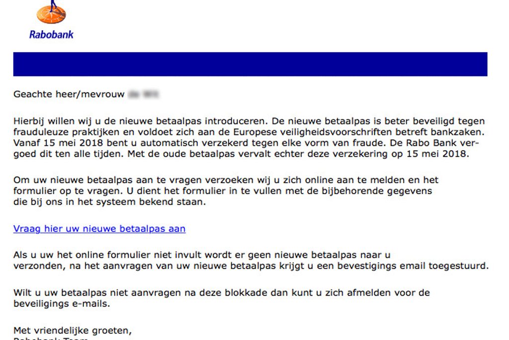 Rabobank-klanten opgelet! Uit naam van deze bank gaat een valse e-mail rond over het aanvragen van een nieuwe betaalpas. Opvallend is dat de naam van de ontvanger in de aanhef van het bericht staat. Het onderwerp van de e-mail luidt: 'kostenloos uw vernieuwde betaalpas aanvragen'.