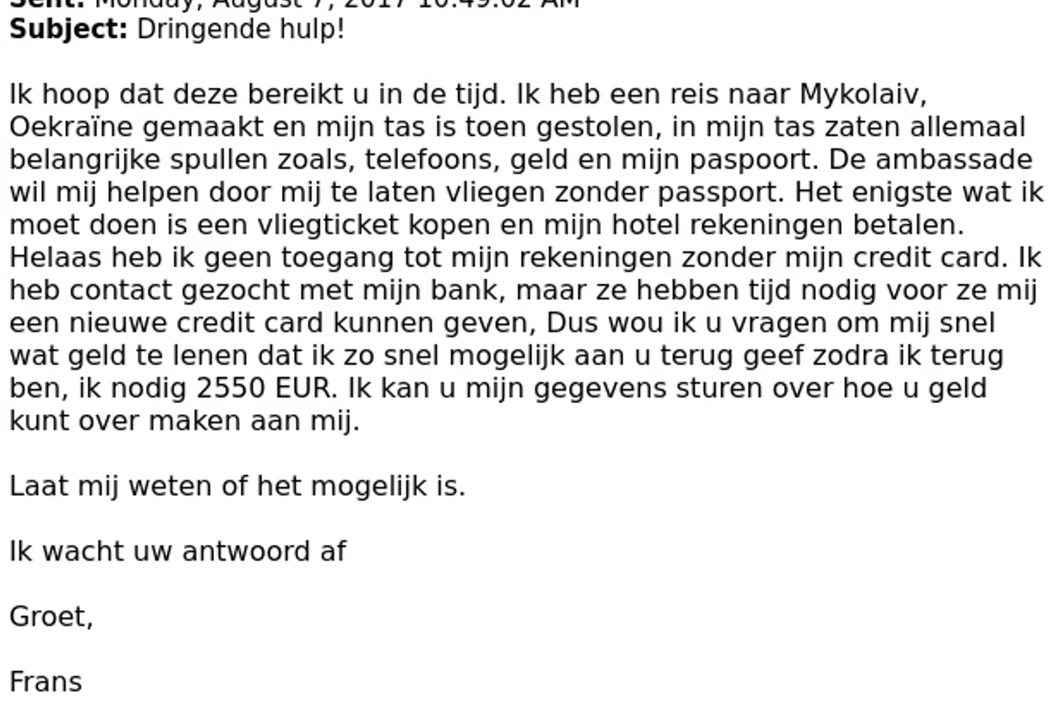 Ook de Fraudehelpdesk waarschuwt voor de zogeheten 'vriend-in-noodverzoeken'. Er zijn verschillende varianten in omloop. Het onderwerp kan variëren, maar de strekking van de e-mail is steeds hetzelfde: de afzender is op reis in de problemen gekomen en heeft dringend geld nodig.