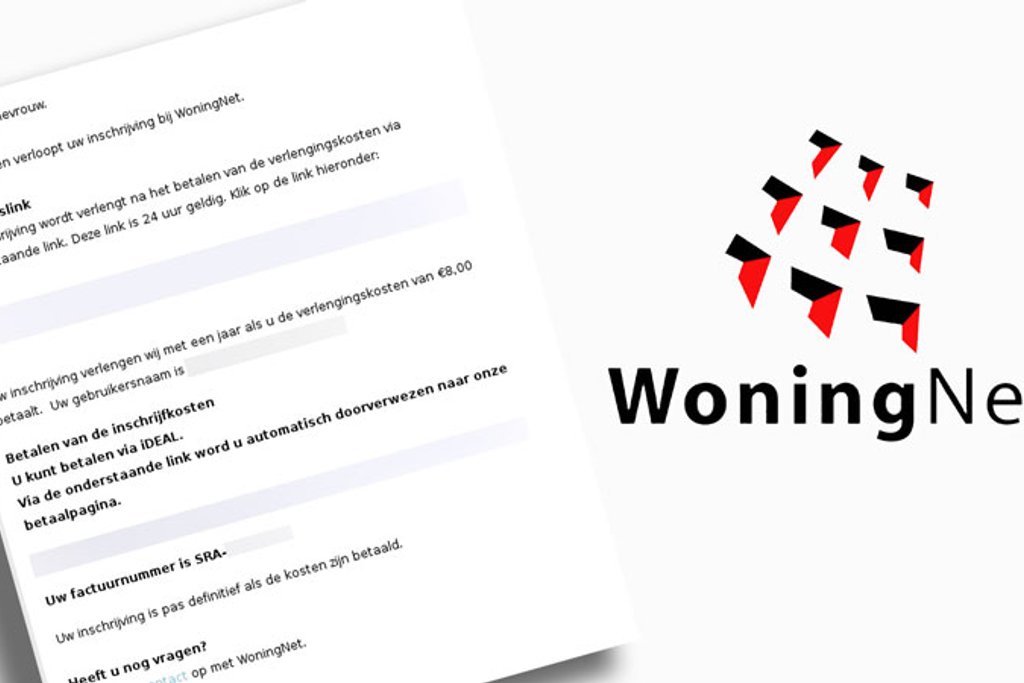 'Over twee weken verloopt uw inschrijving bij WoningNet', luidt een nieuwe phishingmail die uit naam van WoningNet wordt gestuurd. Gebruikers worden verzocht om verlengingskosten te betalen, maar pas op; dit is het werk van online oplichters.