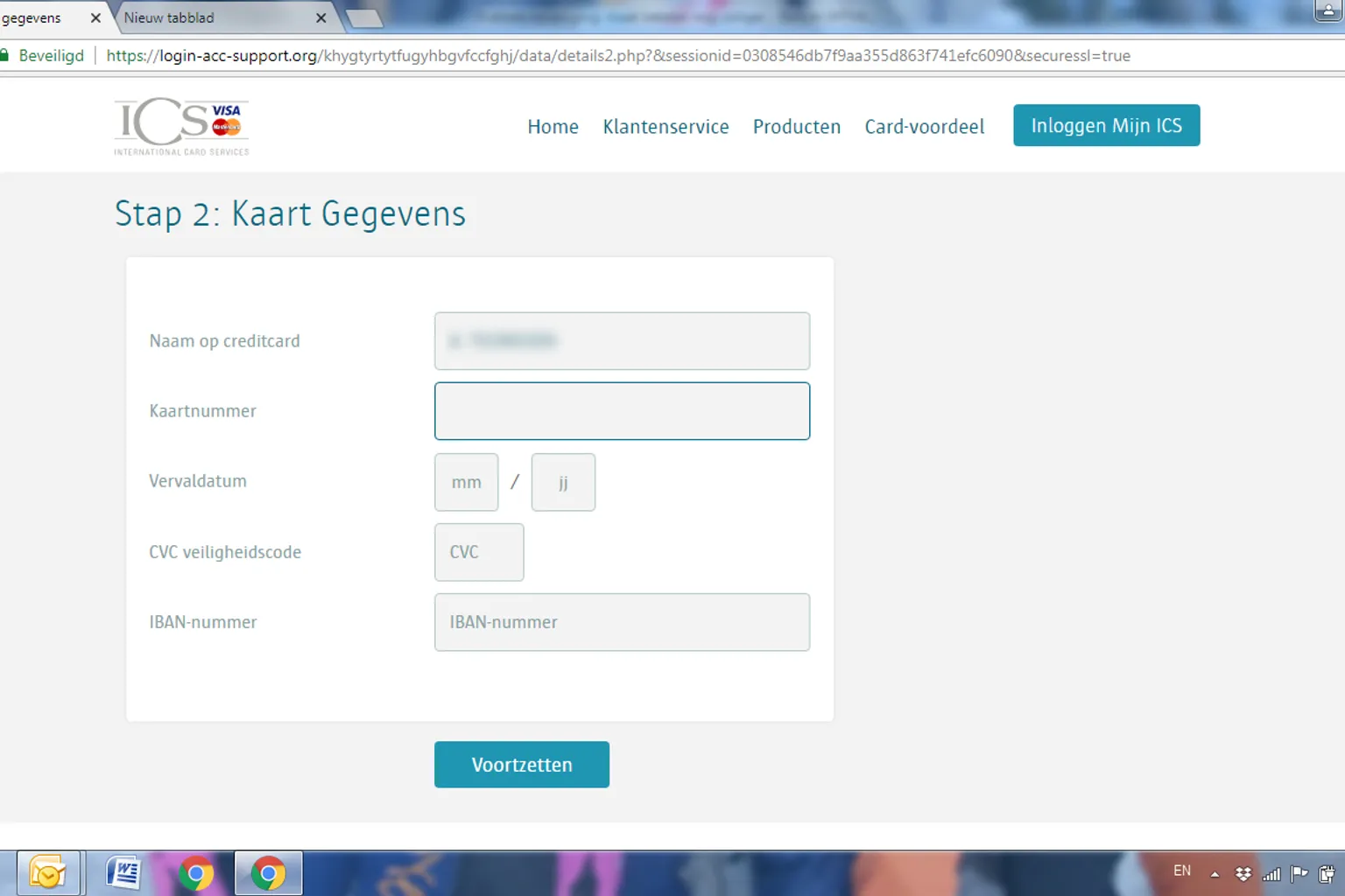 Als je op de link in het bericht klikt, kom je uit op een zeer realistische nepsite. Hier moet je inloggen met je persoonlijke gegevens. Vervolgens wordt er om veel gevoelige informatie gevraagd, zoals de beveiligingscode van je creditcard. Als je deze gegevens invoert, kunnen oplichters jouw creditcard misbruiken.