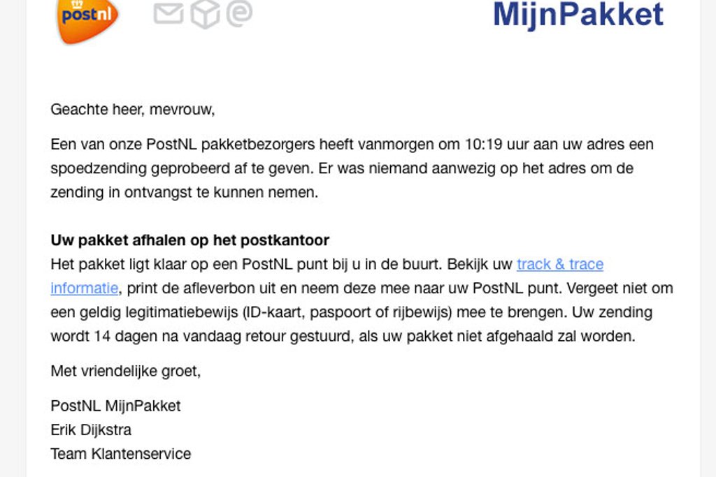 Klik niet op de link! Er wordt door te klikken op de link meteen een kwaadaardig bestand gedownload op je computer. Het onderwerp van de mail is 'Uw zending is niet bezorgd', 'MijnPakket afleverpoging mislukt', 'Gemist afleverpoging' of 'Pakket niet afgeleverd'. Ook de afzender van valse mails kan verschillen.