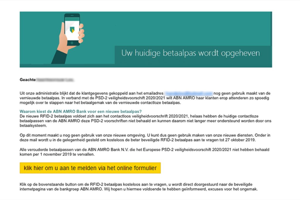 Mail van 'ABN AMRO' over opgeheven betaalpas is nep