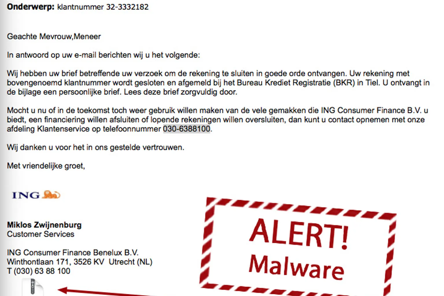 Kwaadwillenden proberen via e-mails uit naam van ING malware te verspreiden. Het gaat om berichten over een verzoek een rekening te sluiten met in de bijlage zogenaamd een persoonlijke brief.