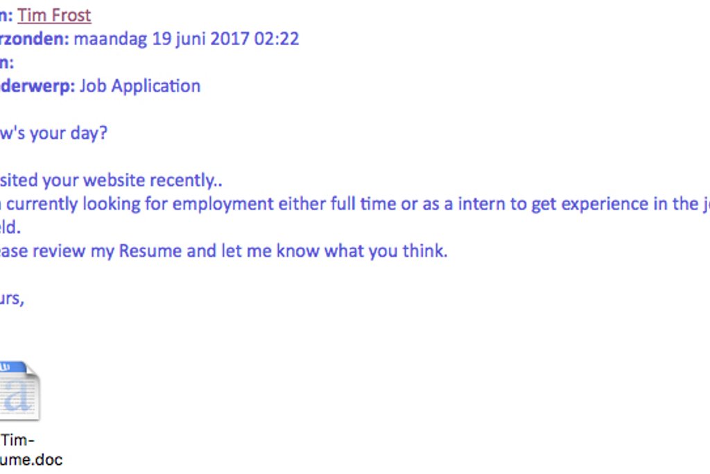 Oplichters proberen op allerlei manieren malware te verspreiden. Ze sturen bijvoorbeeld een open sollicitatie per e-mail. In het meegestuurde cv zit schadelijke software verstopt. Pas dus goed op met het openen van bijlagen!