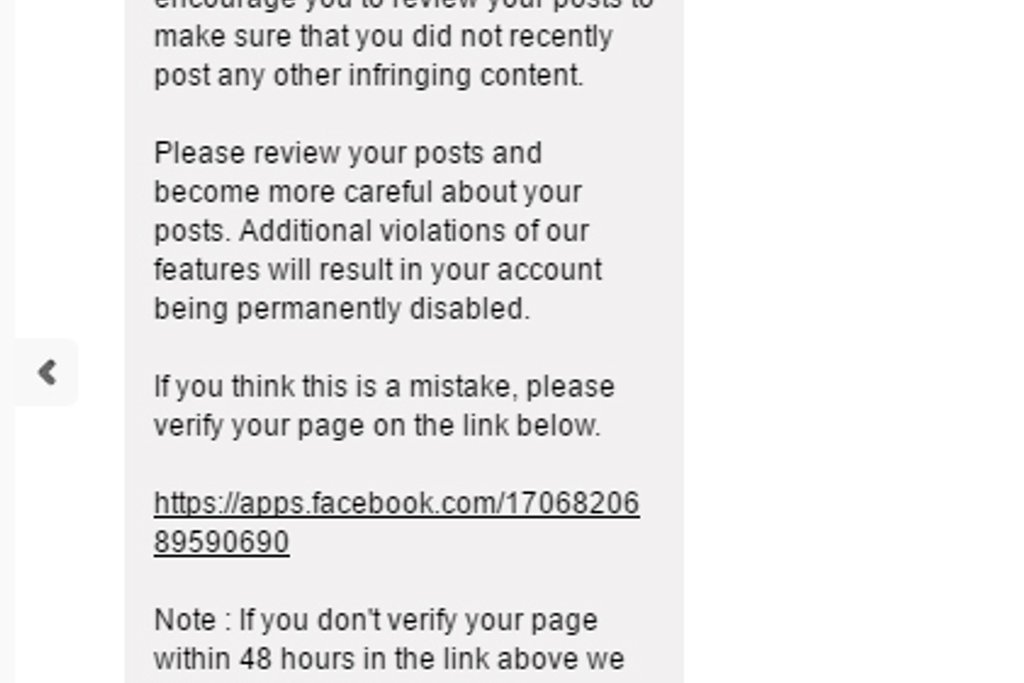 Pas op als je een persoonlijk bericht krijgt waarin staat dat je auteursrechten schendt op je eigen Facebookpagina. Er wordt gevraagd om je Facebookposts te controleren. Vervolgens wordt er gedreigd dat als je je pagina niet binnen 48 uur verifieert, deze wordt verwijderd van Facebook.