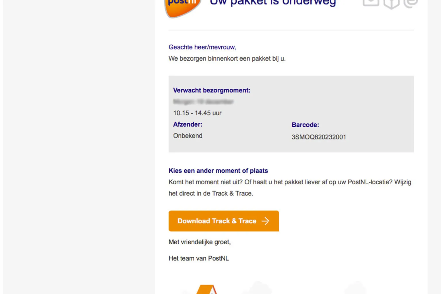 In de e-mail staat dat het postbedrijf binnenkort een pakket bij je komt bezorgen. Hiervoor is een bezorgmoment vastgelegd. Kun je niet deze datum? Of haal je het pakket liever zelf op? Dan dien je op de button 'Track & Trace' te klikken om dit te wijzigen. Echter raden wij dit ten strengste af.