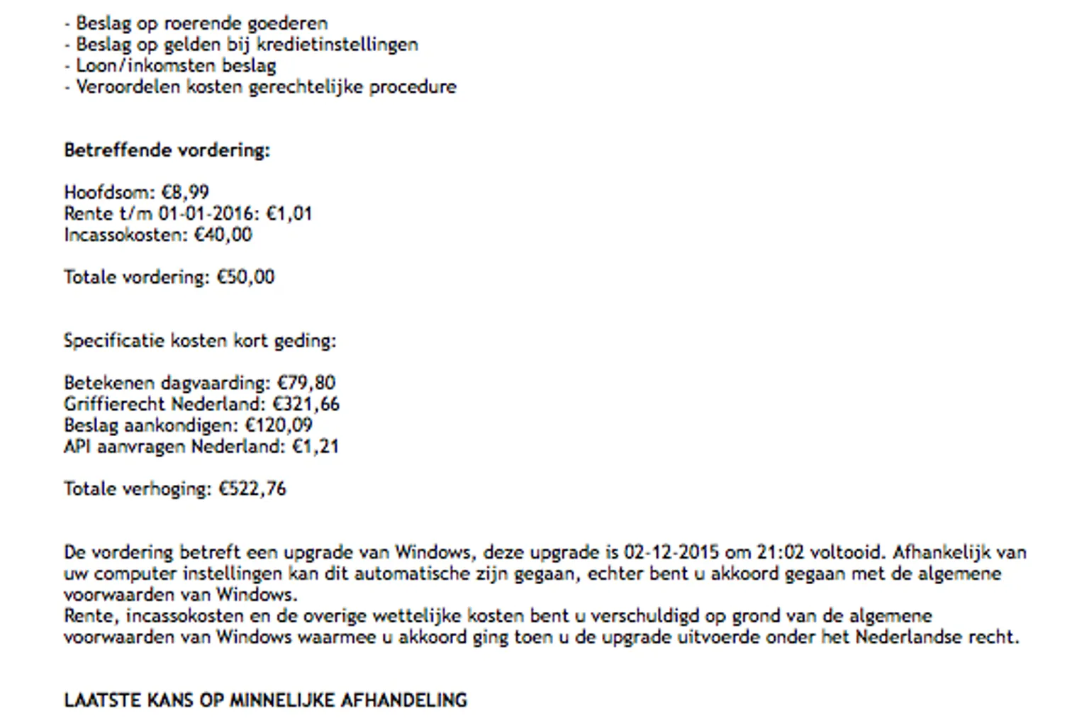 Vorige week waarschuwde de Belgische politie al voor de nep-aanmaningen. Oplichters proberen mensen via de mail te laten betalen voor de upgrade naar Windows 10. Deze upgrade is voor (bijna) iedereen gratis, je hoeft hier dus niet voor te betalen. Inmiddels circuleert de mail ook in Nederland en ontvangt Opgelicht?! ook meldingen van mensen die de nep-aanmaning hebben ontvangen. Volgens de mail moet voor de upgrade betaald worden via een PaySafe Card.