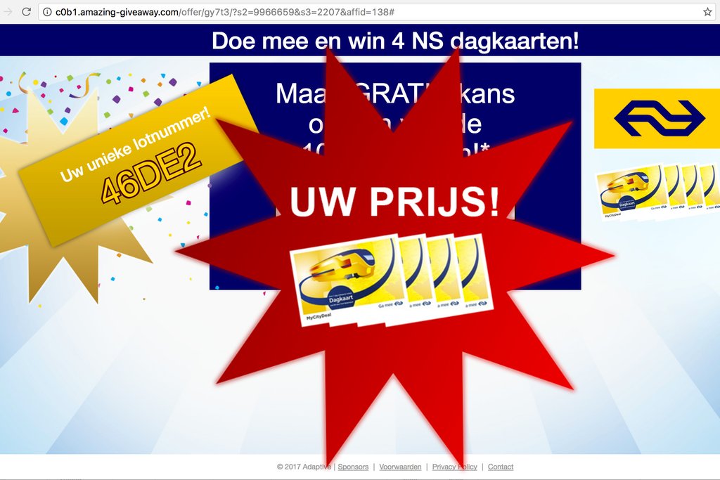 Momenteel is een e-mail in omloop, waarin staat dat 78 mensen vier NS dagkaarten ontvangen. Hiervoor dien je een code te bevestigen. Wie hierop ingaat, krijgt de indruk dat hij de dagkaarten al gewonnen heeft. Later blijkt dit niet helemaal waar te zijn. Je maakt slechts kans op de prijs. En het is bij dit soort acties nog maar de vraag of deze echt uitgekeerd wordt.
