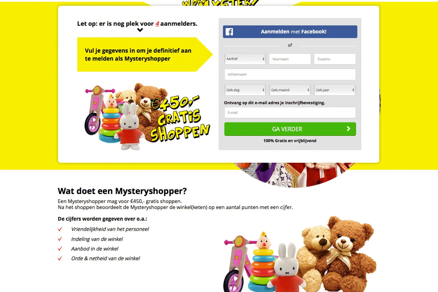 Via de link in de tekst kom je terecht op een website, waarop onder andere het logo van Intertoys te vinden is. Op de pagina staat kort uitgelegd wat mysteryshoppen inhoudt. Door op 'Start je aanmelding' te klikken, kom je bij de vragen terecht. Na het beantwoorden van deze vragen word je gevraagd om jouw persoonlijke gegevens in te vullen.