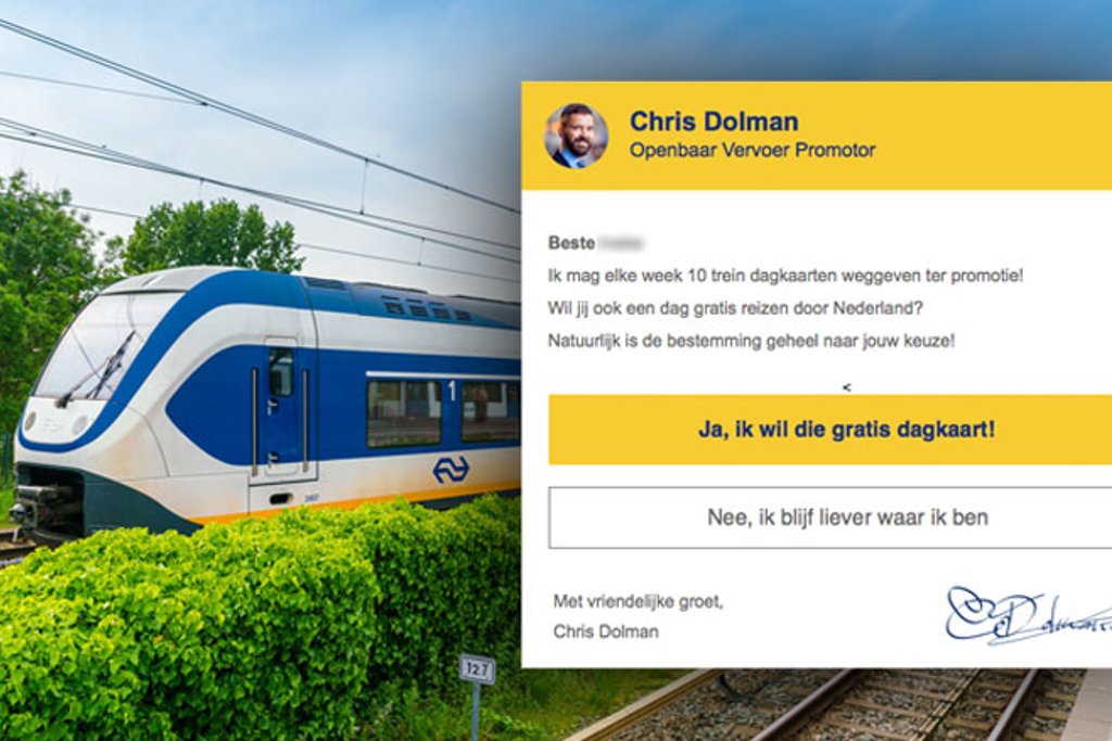 De promotor vertelt je dat hij tien dagkaarten mag weggeven. Met zo'n dagkaart kun je de hele dag door Nederland reizen met de trein. Om kans te maken op een dagkaart moet je op de button in het bericht klikken.