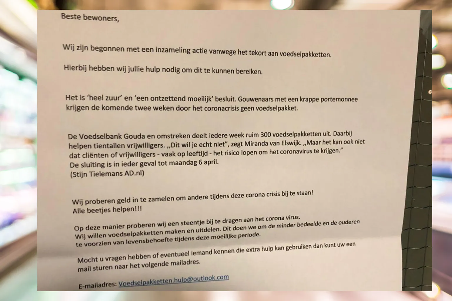 Op de poster staat dat het gaat om een 'heel zuur' en 'ontzettend moeilijk' besluit, maar dat het niet anders kan vanwege de huidige coronacrisis. De inzamelingsactie zou allemaal zijn ten behoeve van de Gouwenaars met een krappe portemonnee. Er worden zelfs 'werknemers' aangehaald, die aangeven dat alle beetjes helpen.