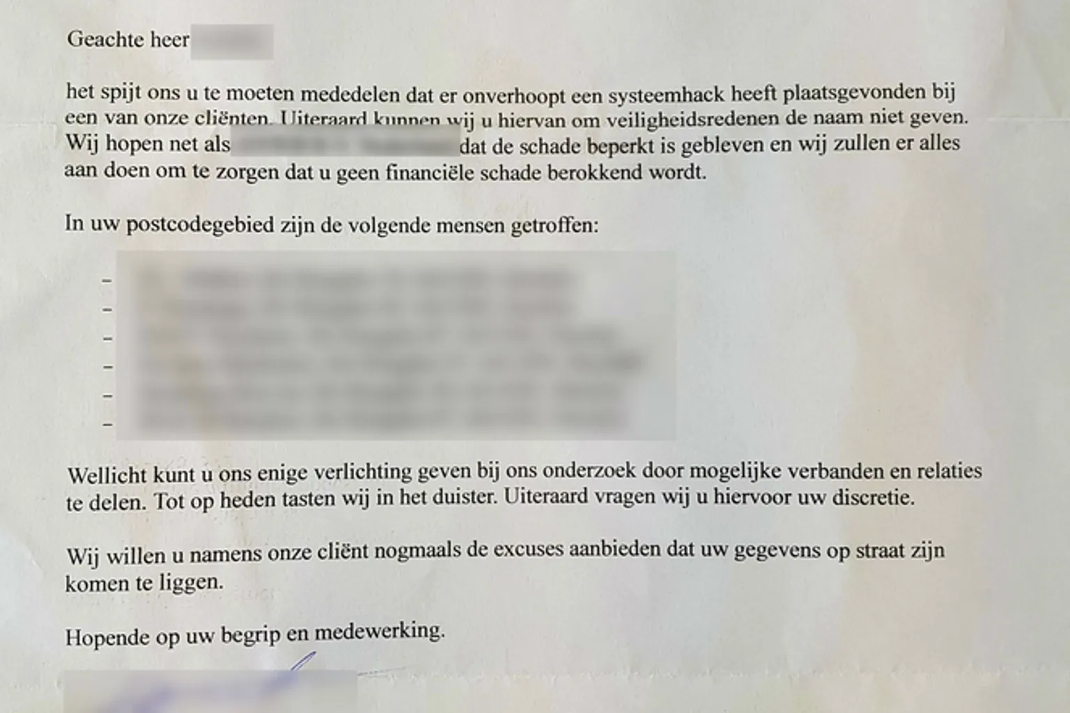 De Fraudehelpdesk waarschuwt dat er in de nepbrief staat dat er een systeemhack heeft plaatsgevonden bij een van hun cliënten. De afzender probeert de ontvanger wijs te maken dat zijn gegevens zijn uitgelekt. Mensen uit de buurt zou hetzelfde zijn overkomen. In de brief staat een lijstje van namen van mensen die bij de ontvanger in de buurt wonen. Verder zegt de afzender te hopen dat de schade meevalt.