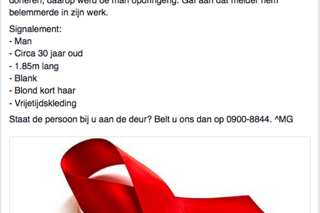 De politie in Eerbeek waarschuwt via Facebook voor een nepcollectant die zegt geld in te zamelen voor 'Aids onder vluchtelingen'.