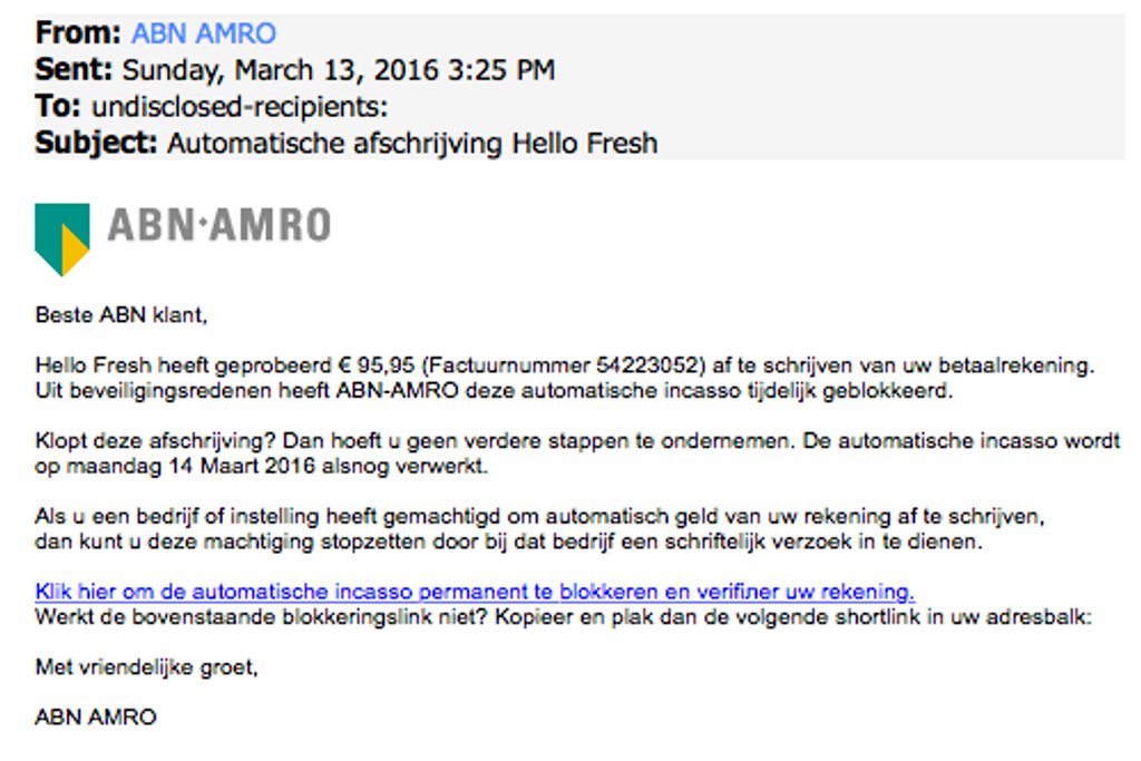 Nepmail 'ABN AMRO' over afschrijving 'Hello Fresh'