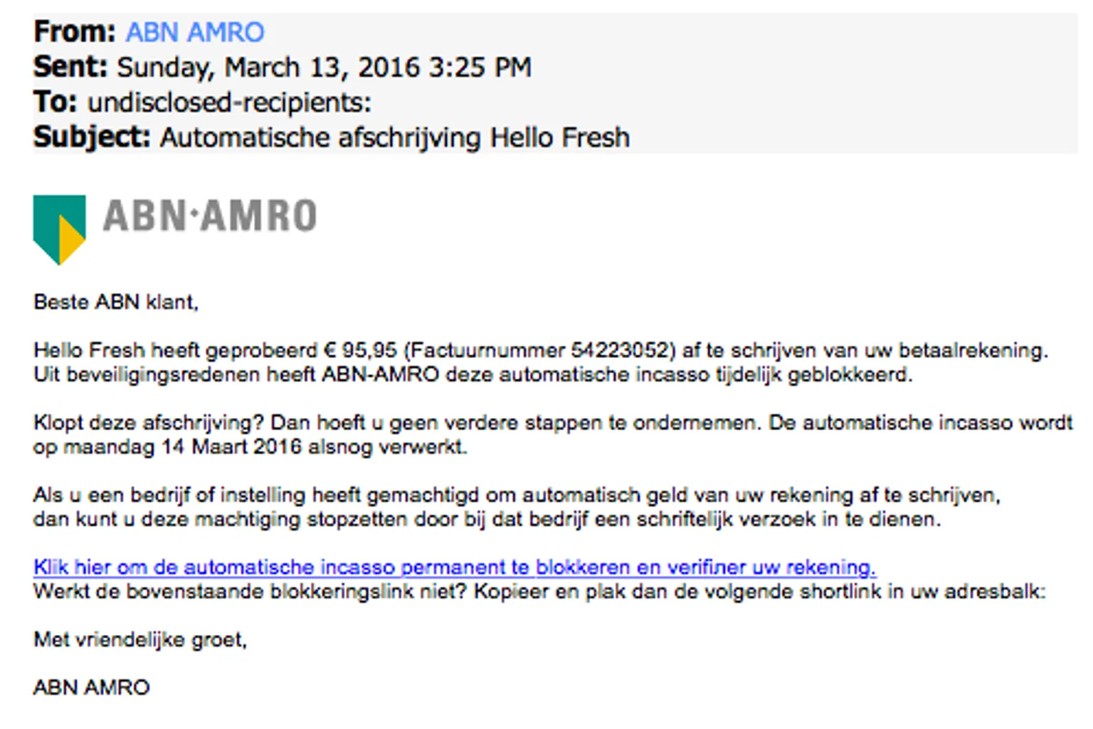 In de e-mail staat dat Hello Fresh heeft geprobeerd geld af te schrijven van je rekening. Vanwege 'beveiligingsredenen' heeft ABN AMRO deze automatische incasso zogenaamd tijdelijk geblokkeerd. Vervolgens staat er dat je de incasso permanent kan blokkeren door op de link in de e-mail te klikken. Doe dit niet! Criminelen proberen op deze manier je bankgegevens in handen te krijgen.