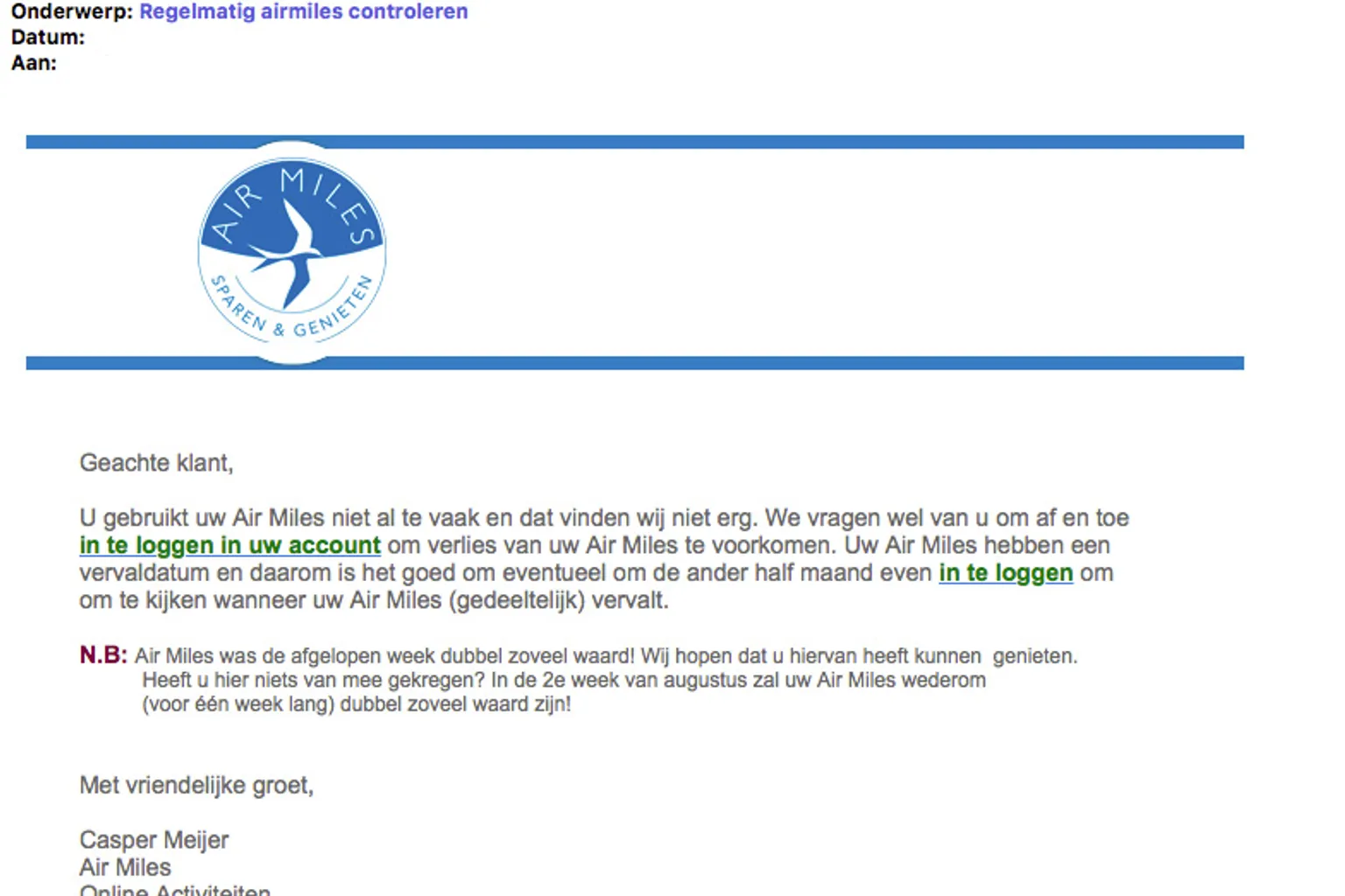 Het bericht heeft een onpersoonlijke aanhef. Vervolgens staat er dat je je Air Miles niet vaak bekijkt. Dit zou niet erg zijn zolang je om de maand inlogt. Anders zouden je punten (gedeeltelijk) komen te vervallen. Dit is onzin!