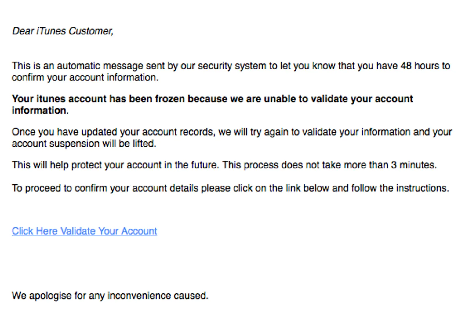 In een mail uit naam van Apple staat dat het account van de ontvanger is 'bevroren' en dat binnen 48 uur de gegevens bevestigd moeten worden.