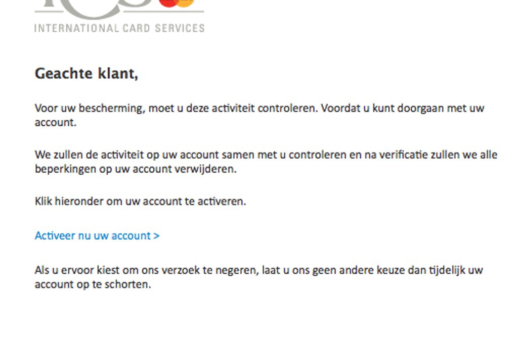 In een valse mail uit naam van ICS staat dat er een activiteit gecontroleerd moet worden. Anders kun je zogenaamd niet doorgaan met je account.