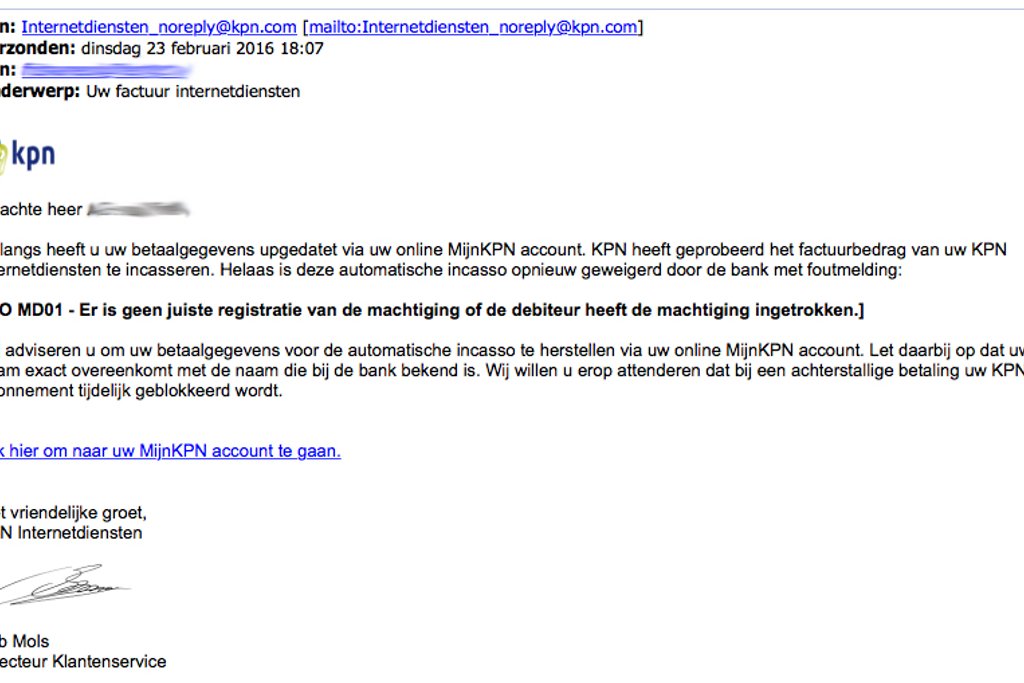 Er zou iets fout zijn gegaan met een automatische incasso. Vervolgens word je gevraagd in te loggen op een website met je KPN gegevens. De website lijkt misschien op de site van KPN, maar is nep.