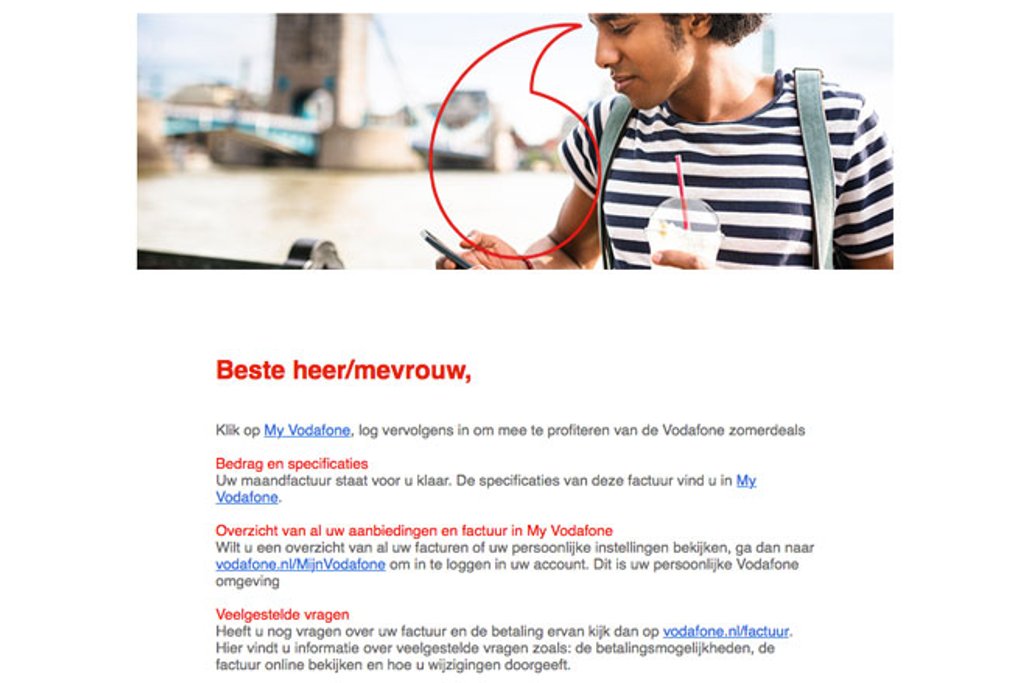 Het is moeilijk om meteen te zien dat je hier te maken hebt met een valse e-mail. De oplichters maken namelijk gebruik van 'e-mailspoofing'. Dit is een truc waardoor het lijkt alsof de e-mail daadwerkelijk van Vodafone komt. Tel daar een mooie website bij op en de oplichting is compleet. Nogmaals: trap hier niet in!