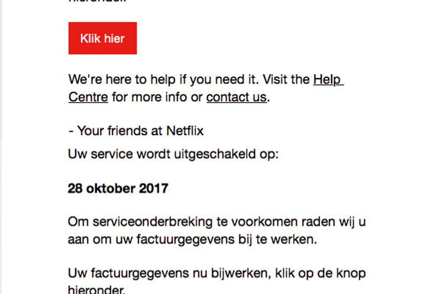 In het bericht staat dat de betaling voor je laatste factuur is mislukt. Daarom wordt je service zogenaamd uitgeschakeld op 28 oktober.