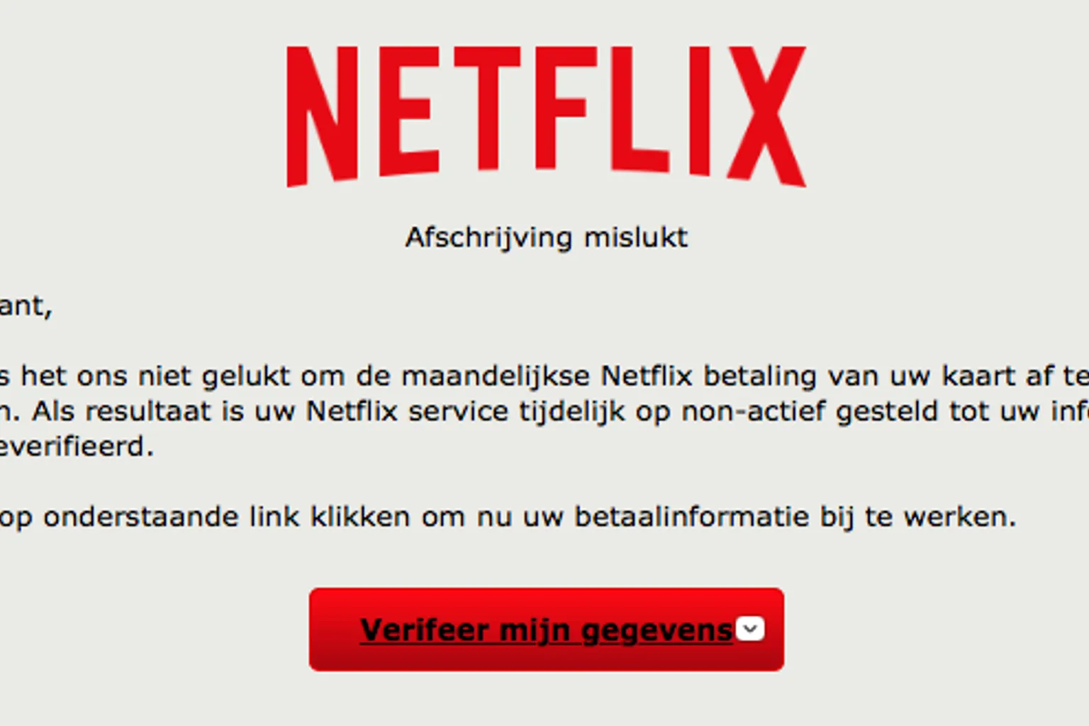 Fraudeurs hebben het gemunt op klanten van Netflix. Door middel van een phishingmail proberen ze persoonlijke informatie in handen te krijgen. Trap er niet in!