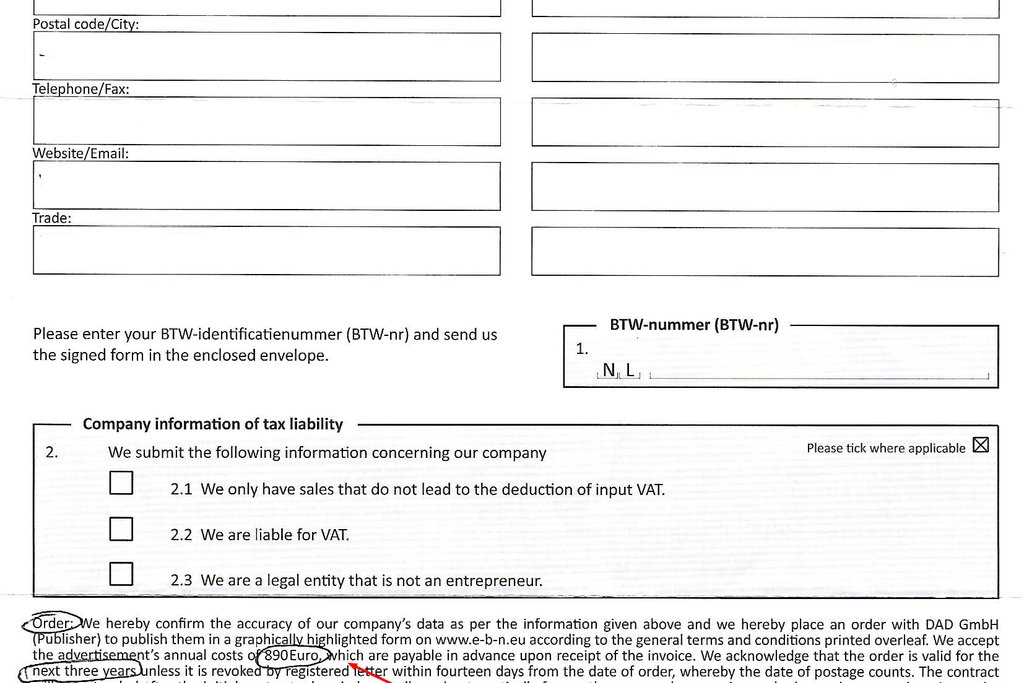 Op de offerte staat een ander bedrag genoemd dan in 2015. Eerder werd gesproken van € 677,-. Nu is het tarief € 890,-. Waarvoor je betaalt is onduidelijk. Het zou gaan om een advertentie op een bepaalde site. Daar komt nog bij dat het contract automatisch wordt verlengd, tenzij het drie maanden voor het aflopen ervan wordt opgezegd. De looptijd bedraagt drie jaar.