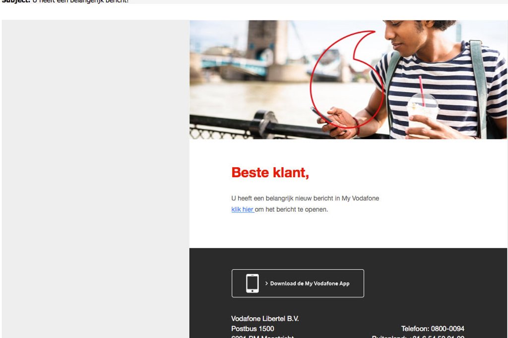 Let op! Er is een e-mail in omloop die zogenaamd van Vodafone afkomstig is. Hierin staat dat je een belangrijk nieuw bericht hebt. Dit is phishing.