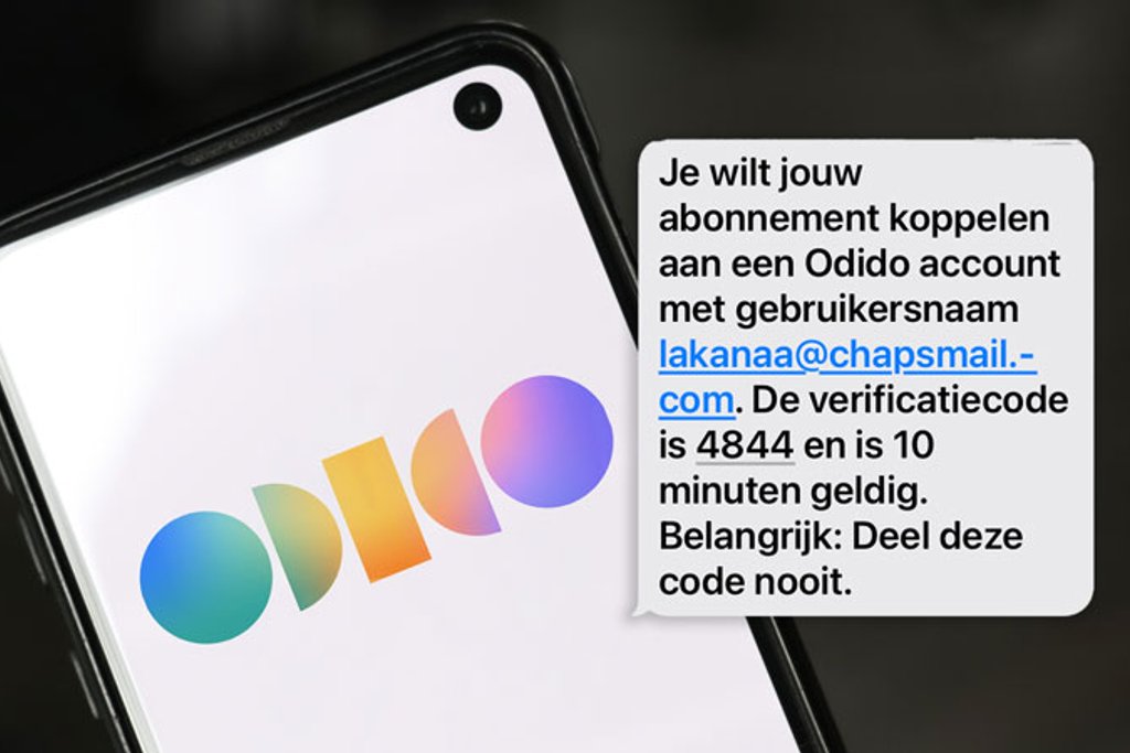 Cybercriminelen sms'en namens Odido dat je je abonnement zou willen koppelen aan een Odido-account met de gebruikersnaam '[email protected]'. Ook staat er een verificatiecode in het bericht (4844), die zogenaamd tien minuten geldig is.
