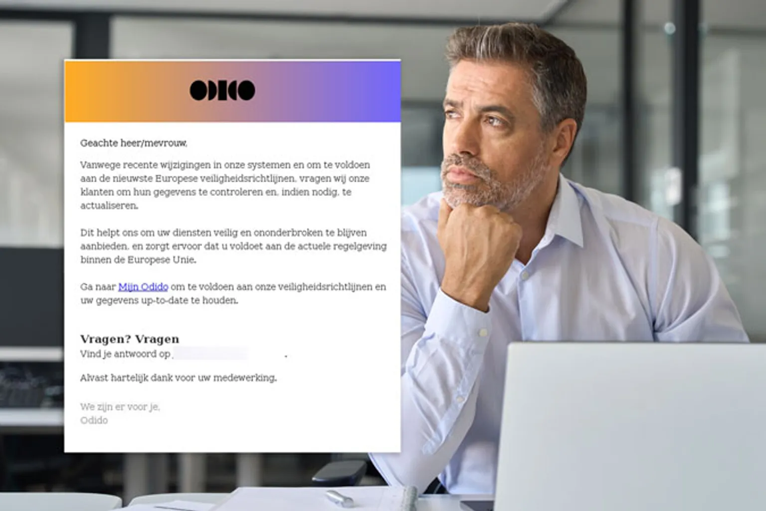 'Geachte heer/mevrouw', begint het frauduleuze bericht. Dit is al verdacht. Odido spreekt je namelijk altijd persoonlijk aan in hun communicatie. Ook staat er twee keer 'Vragen' onderaan de mail. Zo'n slordige fout mag je niet verwachten van een betrouwbare partij. Dit zijn al duidelijke signalen dat je met phishing te maken hebt.