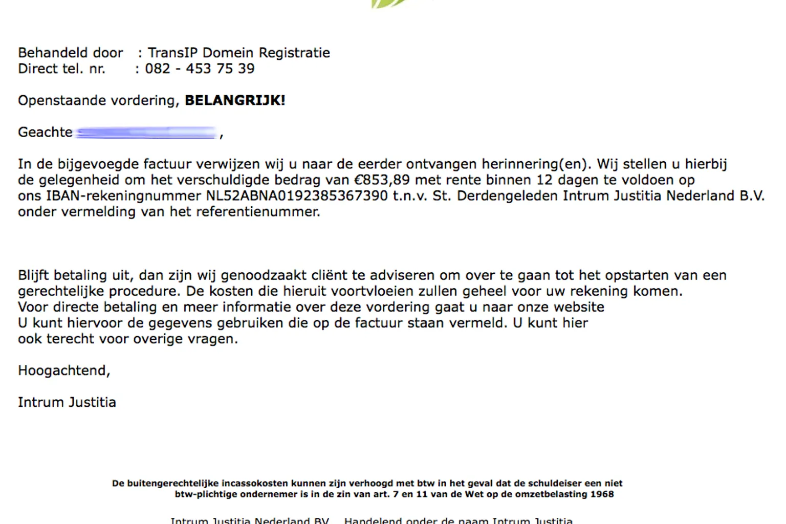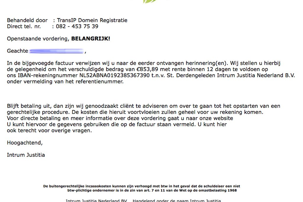Openstaande factuur 'Intrum Justitia'
