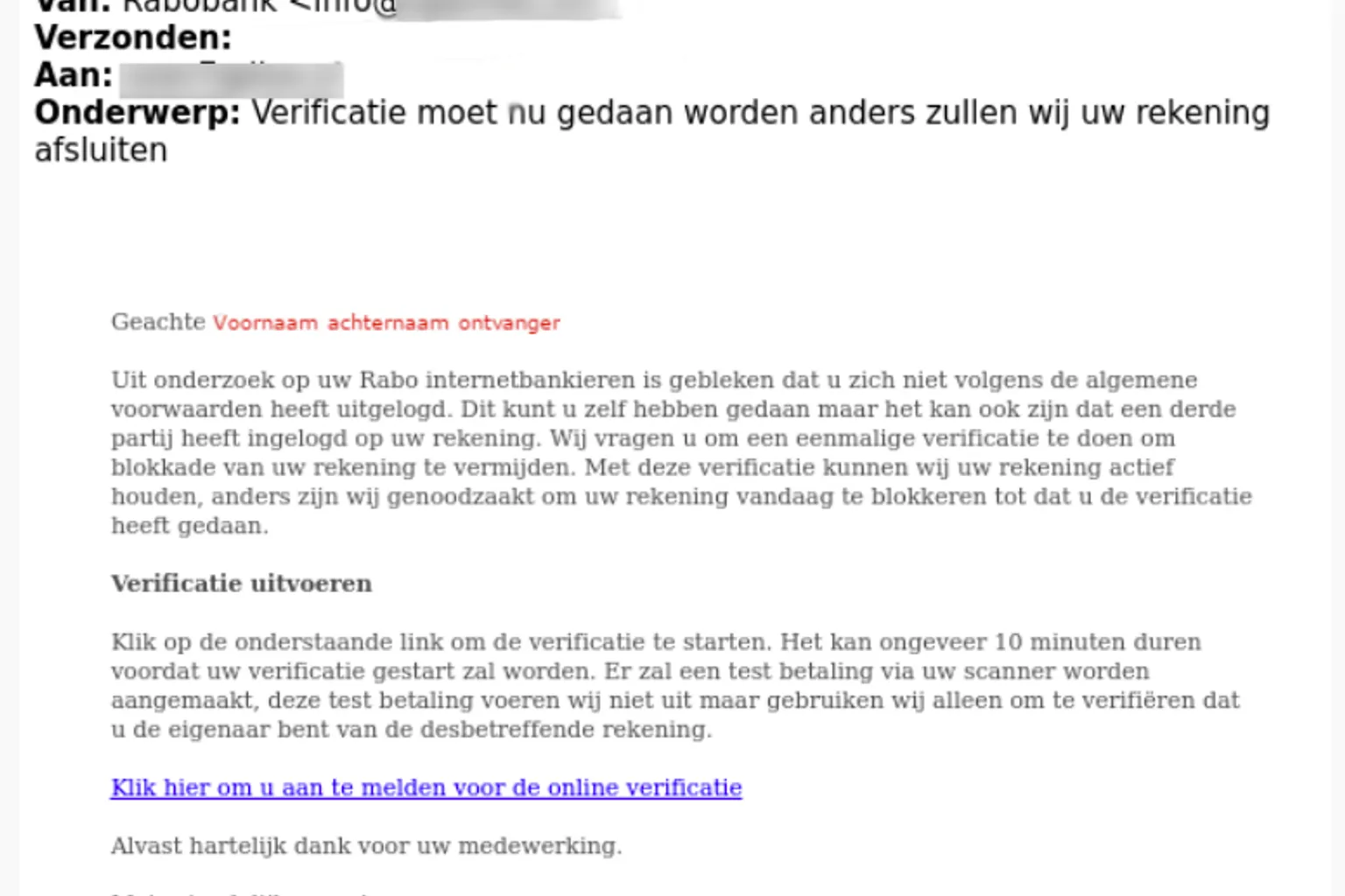 De Fraudehelpdesk waarschuwt voor zeer slinkse nepmails. De berichten zijn link omdat een lokaal filiaal van Rabobank onderaan het bericht wordt genoemd als afzender. Iemand die in Groningen woont, kan dus een e-mail krijgen die afkomstig lijkt van Rabobank Groningen. Ook staat in de aanhef boven het bericht de voor- en achternaam van de ontvanger. Wie de e-mail krijgt, zal dus zien dat hij persoonlijk wordt aangesproken.