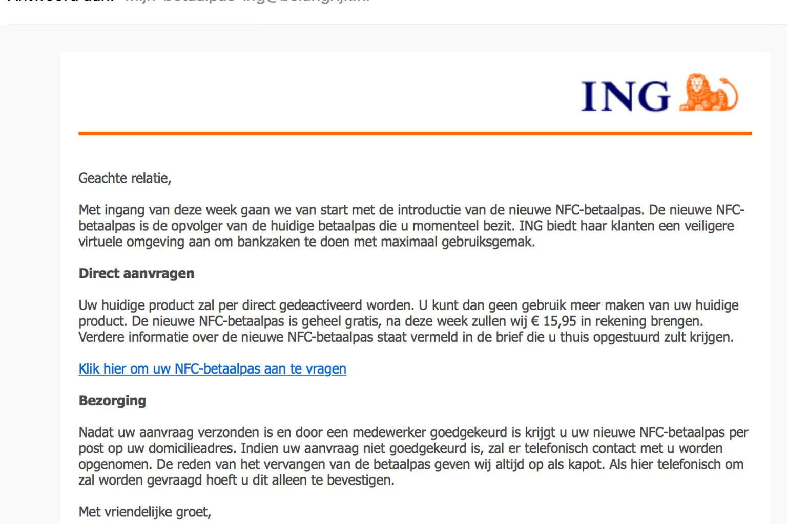 Volgens de e-mail gaat ING deze week van start met de introductie van een nieuwe NFC-betaalpas. Daarom zou je huidige betaalproduct per direct gedeactiveerd worden. De nieuwe bankpas is deze week nog gratis, daarna wordt € 15,95 berekend.