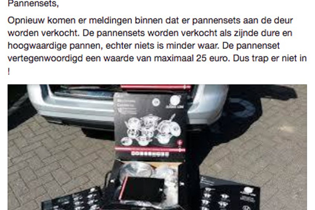 De politie Zuidoost-Drenthe waarschuwt voor verkopers die langs de deuren gaan om pannensets aan de man te brengen.