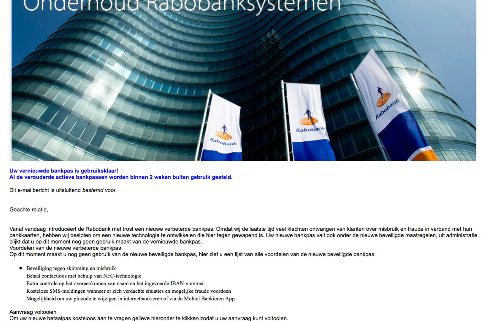 Let op als je een e-mail ontvangt waarin staat dat je Rabobankpas verouderd is en binnen twee weken buiten gebruik wordt gesteld. Dit is een valse e-mail. Trap er niet in!