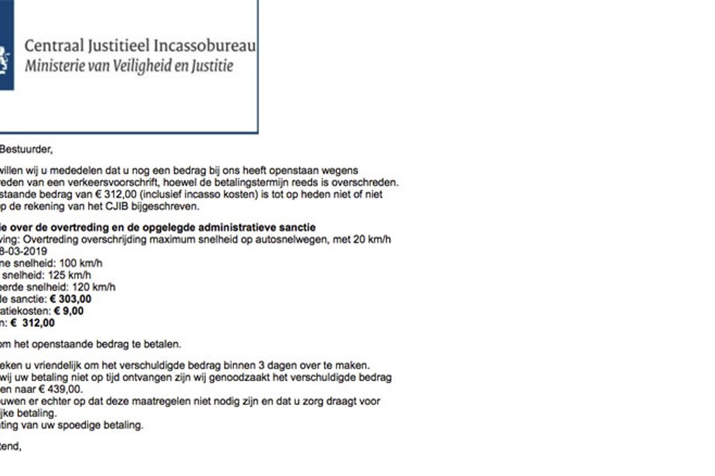'Beste bestuurder, bij deze willen wij u mededelen dat u nog een bedrag bij ons heeft openstaan wegens het overtreden van een verkeersvoorschrift.' Het bedrag dat je zogenaamd moet betalen is 312 euro. Doe dit niet. Je hebt te maken met een phishingmail.