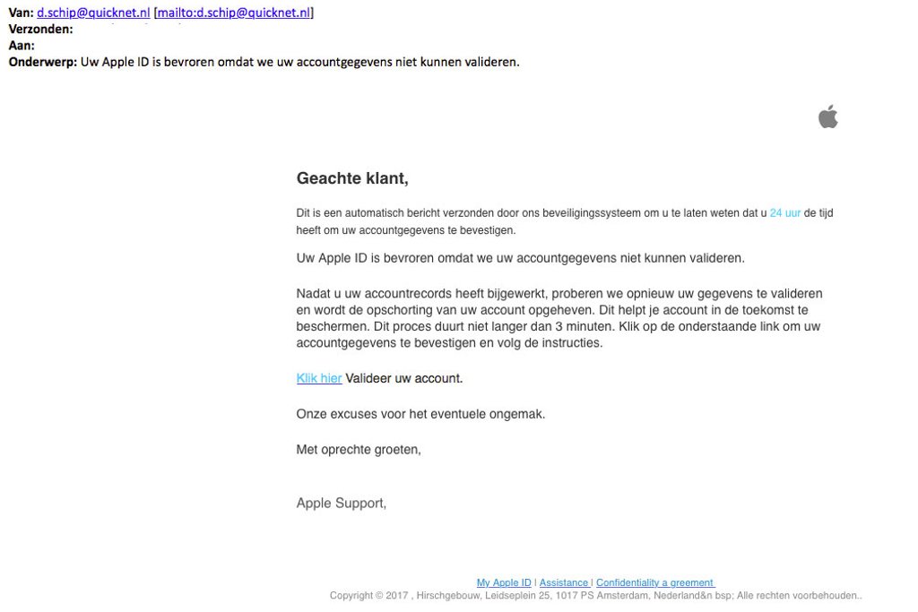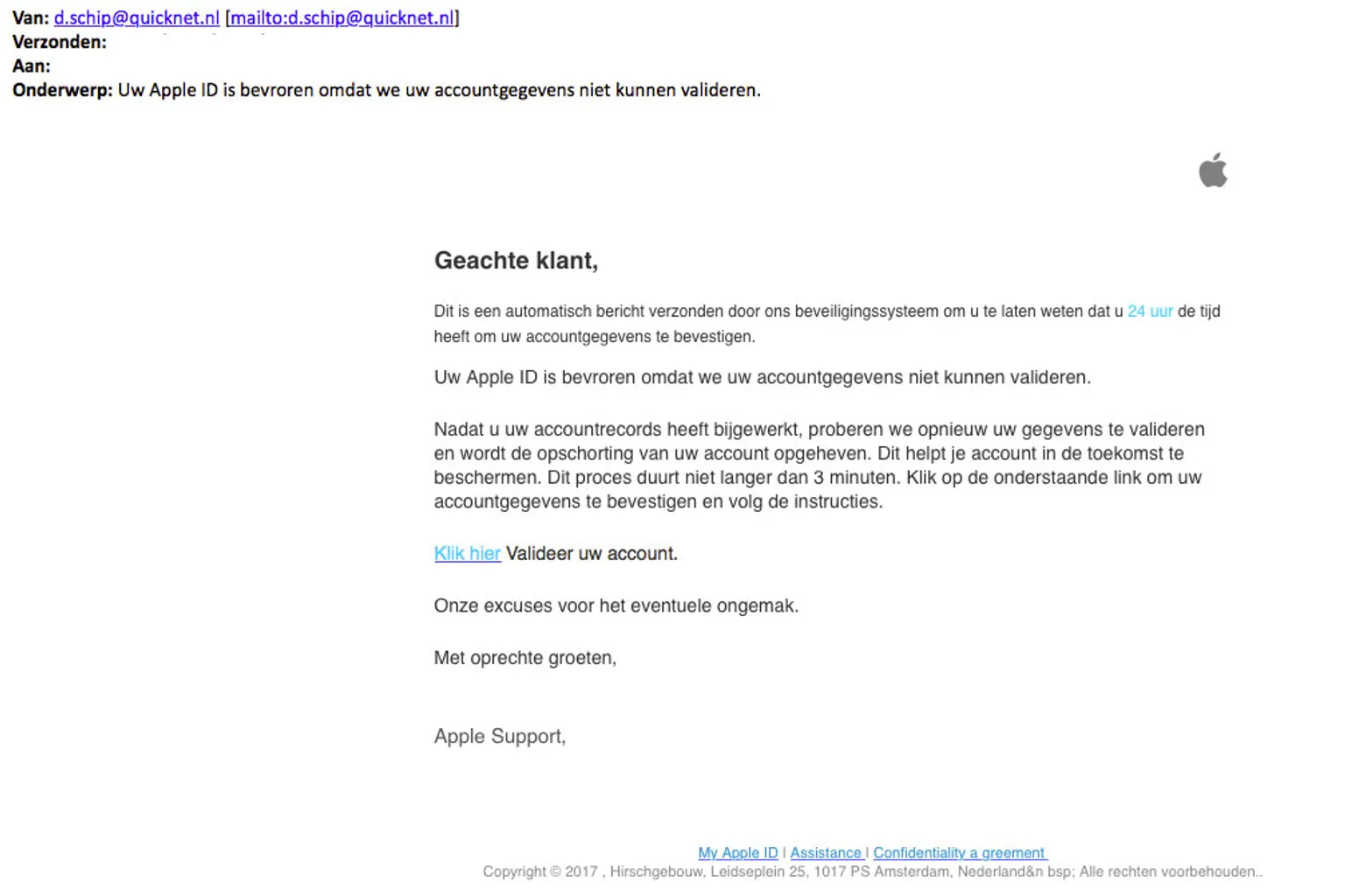 In de e-mail staat dat je account bevroren is, omdat Apple je gegevens niet kan valideren. Je hebt zogenaamd 24 uur de tijd om je account gegevens te bevestigen. Dit kun je doen wanneer je op de link in het bericht klikt.