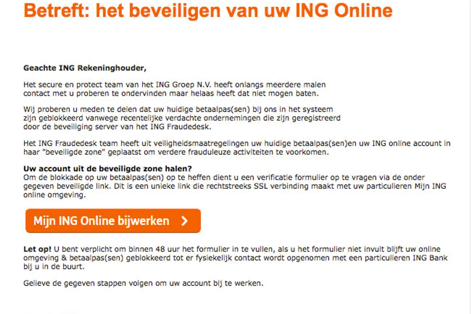 De bank stuurt haar klanten geen berichten over geblokkeerde betaalpassen via de e-mail. Laat je dus niet misleiden. Wanneer je toch twijfels hebt, kun je contact zoeken met de ING.