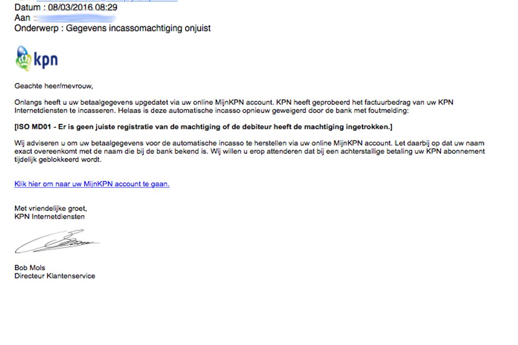 Let goed op! Wanneer je met je muis op de link gaat staan (zonder te klikken), zie je waar de link je naar toestuurt. Is dit geen link naar een pagina op KPN.com? Klik dan niet op de link. Criminelen hopen dat je op deze nepsite je gegevens invult.