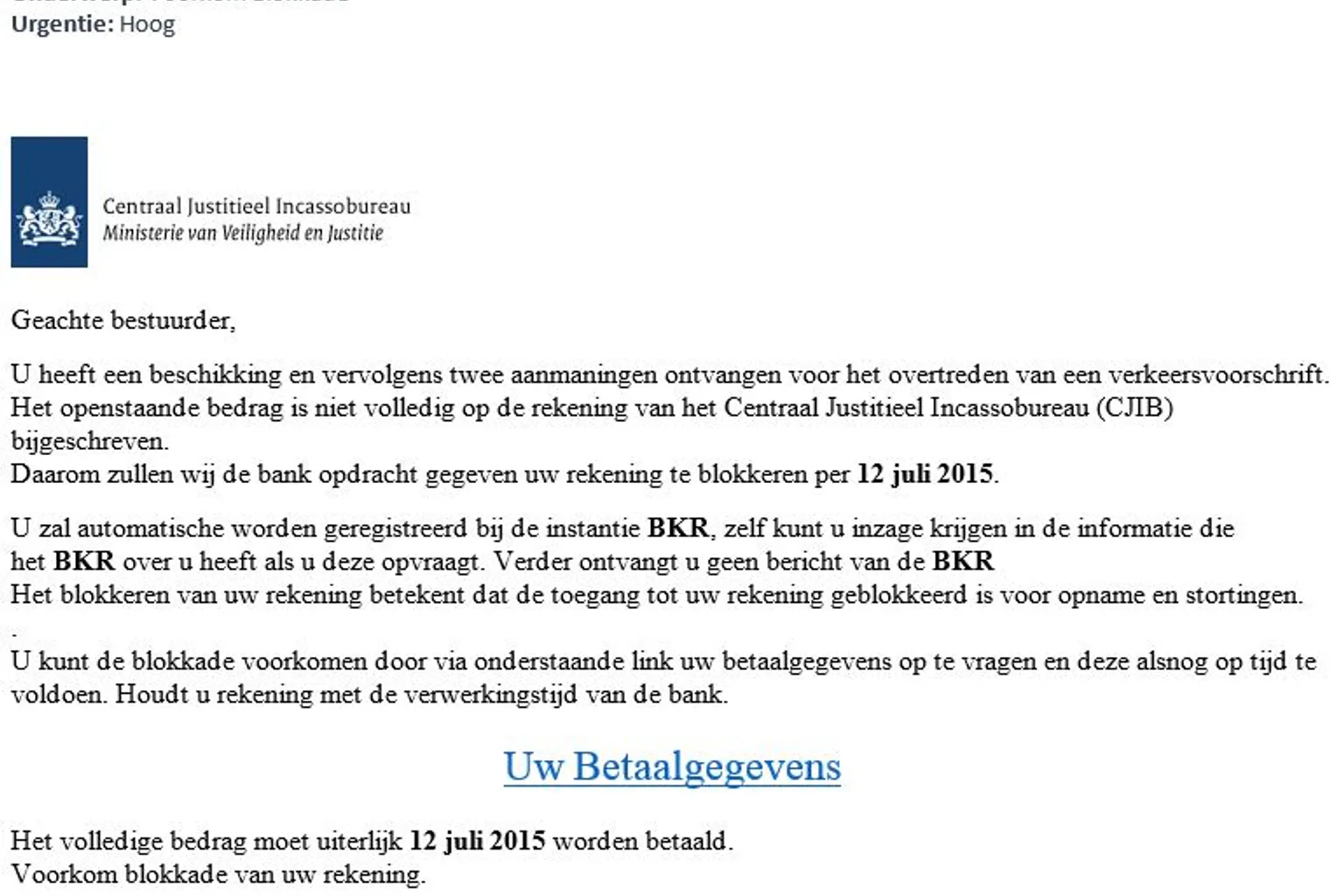 De fraudeurs proberen je bang te maken zodat je snel tot actie overgaat. Zo beweren ze dat de rekening wordt geblokkeerd en dat het incassobureau het BKR inschakelt. Trap hier niet in: de bijgevoegde link in het bericht verwijst niet naar een website van het CJIB maar naar een valse website, gebouwd om je gegevens te ontfutselen.