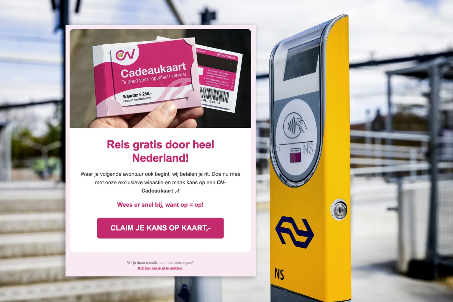 Reis je vaak met het openbaar vervoer naar school, werk, familie of vrienden? Online fraudeurs maken je namens OV-chipkaart wijs dat je kans maakt op een cadeaukaart ter waarde van 250 euro. Dat klinkt misschien als een fijne meevaller, maar deze winactie is niet echt van OV-chipkaart. Het bedrijf meldt namelijk op zijn website geen aanbiedingen of winacties te versturen. Ook plaatsen ze deze niet op social media.