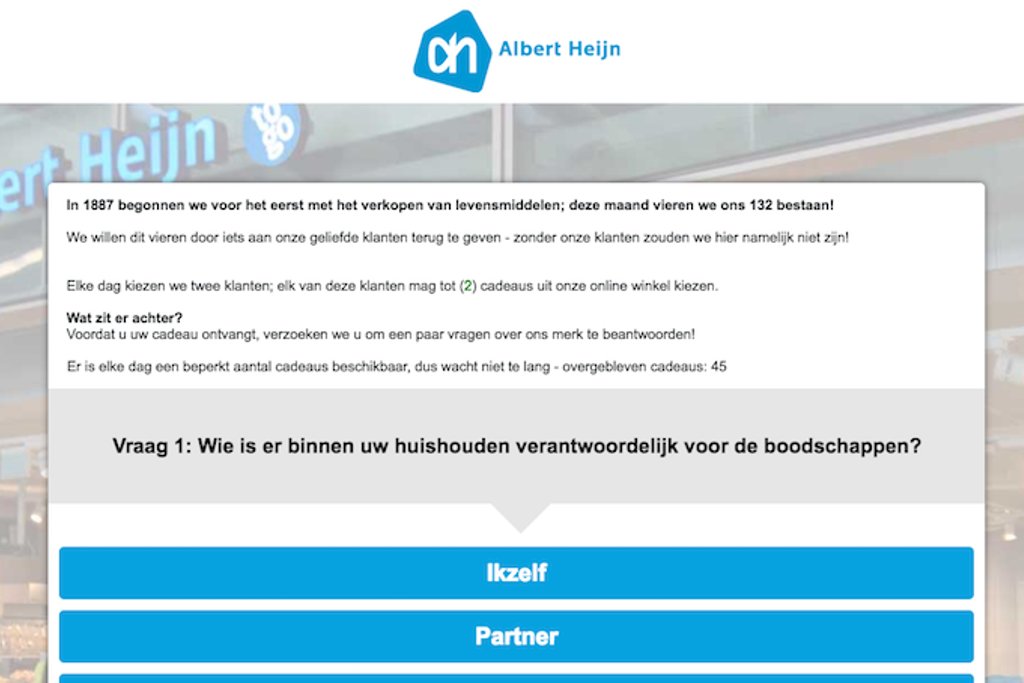 Het enige wat je hoeft te doen is het invullen van een enquête. 'Hoe vaak je boodschappen? Op welk tijdstip? Wie doen de boodschappen?' Het lijkt onschuldig. Na het invullen van de enquête kom je op een pagina waar je laptops en smartphones cadeaus krijgt. Je hoeft alleen de verzendkosten te betalen. Doe dit niet! Oplichters gaan er met het geld en je gegevens vandoor.