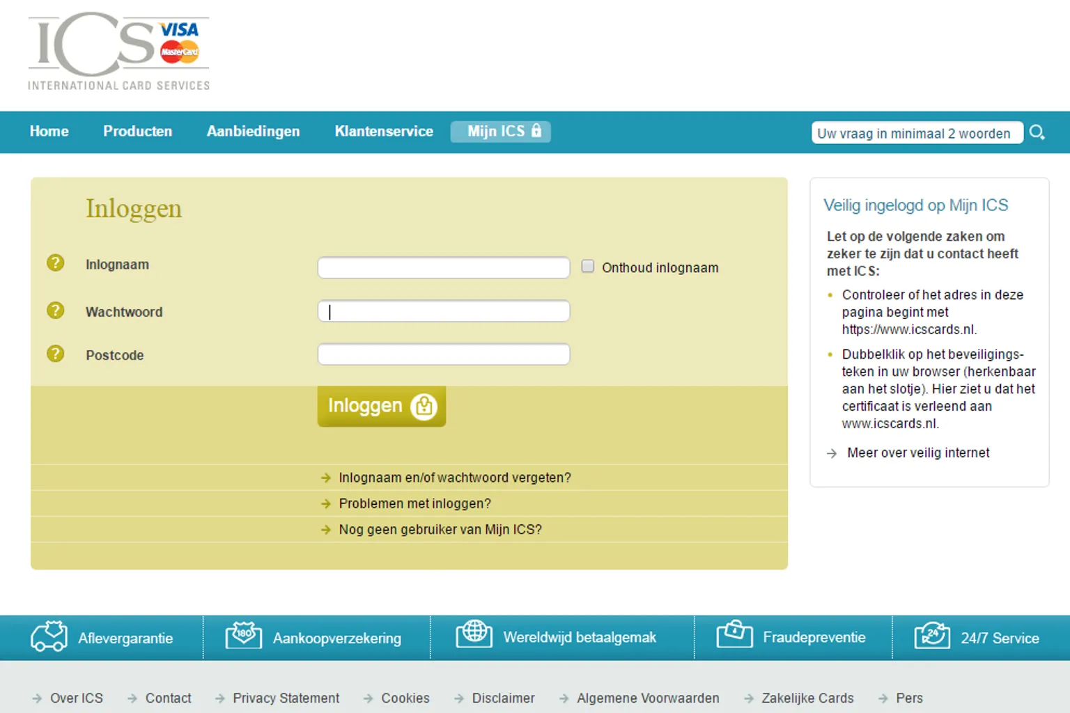 Volgens het bericht moet je je gegevens updaten. Opvallend is de schrijffout in het woord gegevens: 'Gegevan'. Je kan de informatie zogenaamd bijwerken door op de link in de tekst te klikken. Wie op deze link klikt, komt op een pagina terecht die sterk lijkt op de echte site van ICS. Criminelen vragen je op de valse website in te loggen op je account van ICS. Let op: via de site proberen criminelen je gegevens afhandig te maken.