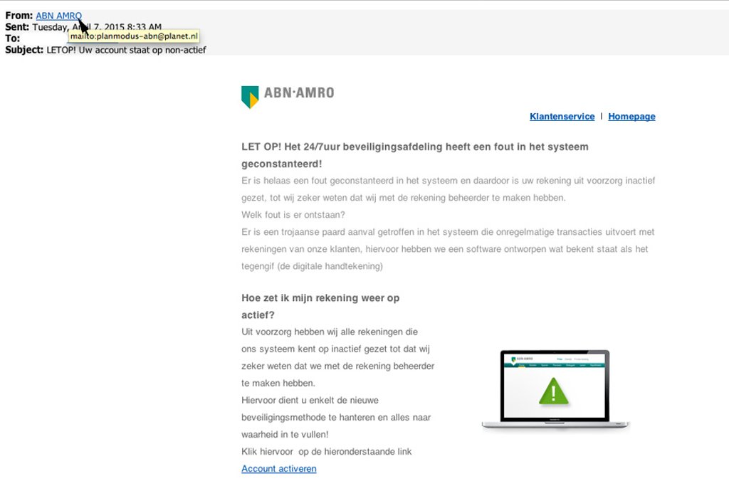 De zender beweert dat je account is aangevallen door een virus: een trojaans paard. Om veiligheidsoverwegingen is je account na deze aanval gesloten. Om deze reden is het nodig je account weer te heractiveren. Dit doe je door op de onderstaande link te klikken. Doe dit niet! De link stuurt je door naar een malafide website die gebouwd is door oplichters om je persoonlijke gegevens te stelen. Je kan aan de e-mail zien dat de afzender niet ABN AMRO is wanneer je met de cursor op de afzender rust. Je ziet dan [email protected] verschijnen.