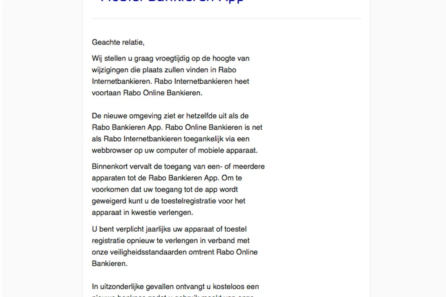 In de e-mail staat geschreven dat de Rabobank wijzigingen in hun app zal invoeren. Rabo Internetbankieren zal voortaan Rabo Online Bankieren heten.
