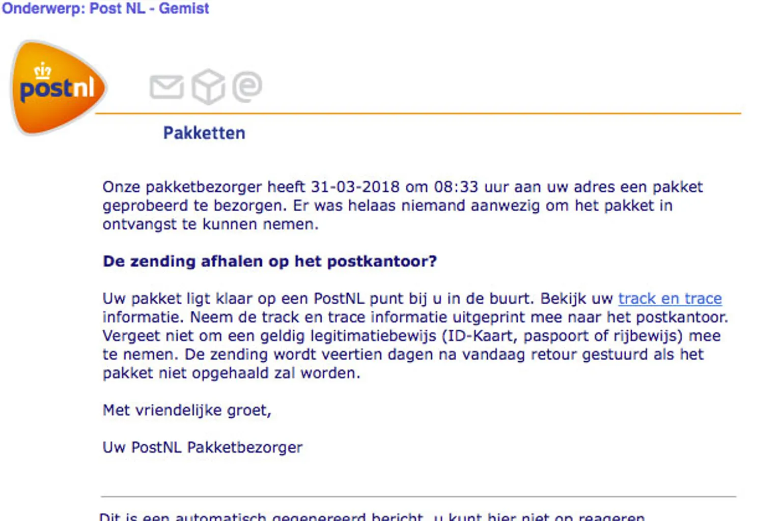 In de e-mail staat geschreven dat een medewerker van PostNL geprobeerd heeft een pakketje bij je te bezorgen. Er zou toen echter niemand aanwezig zijn geweest om het in ontvangst te nemen.