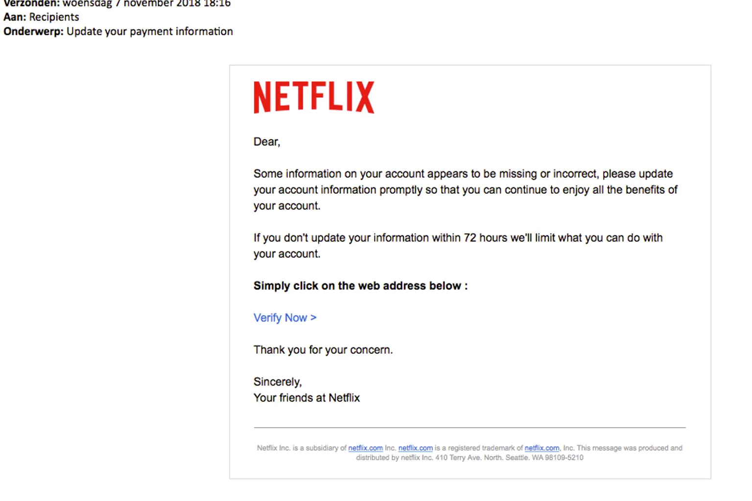 Momenteel gaat er een valse, Engelstalige mail uit naam van Netflix rond, waarin staat dat je accountgegevens niet correct of compleet zijn. Pas hiervoor op! Dit is een phishingmail.