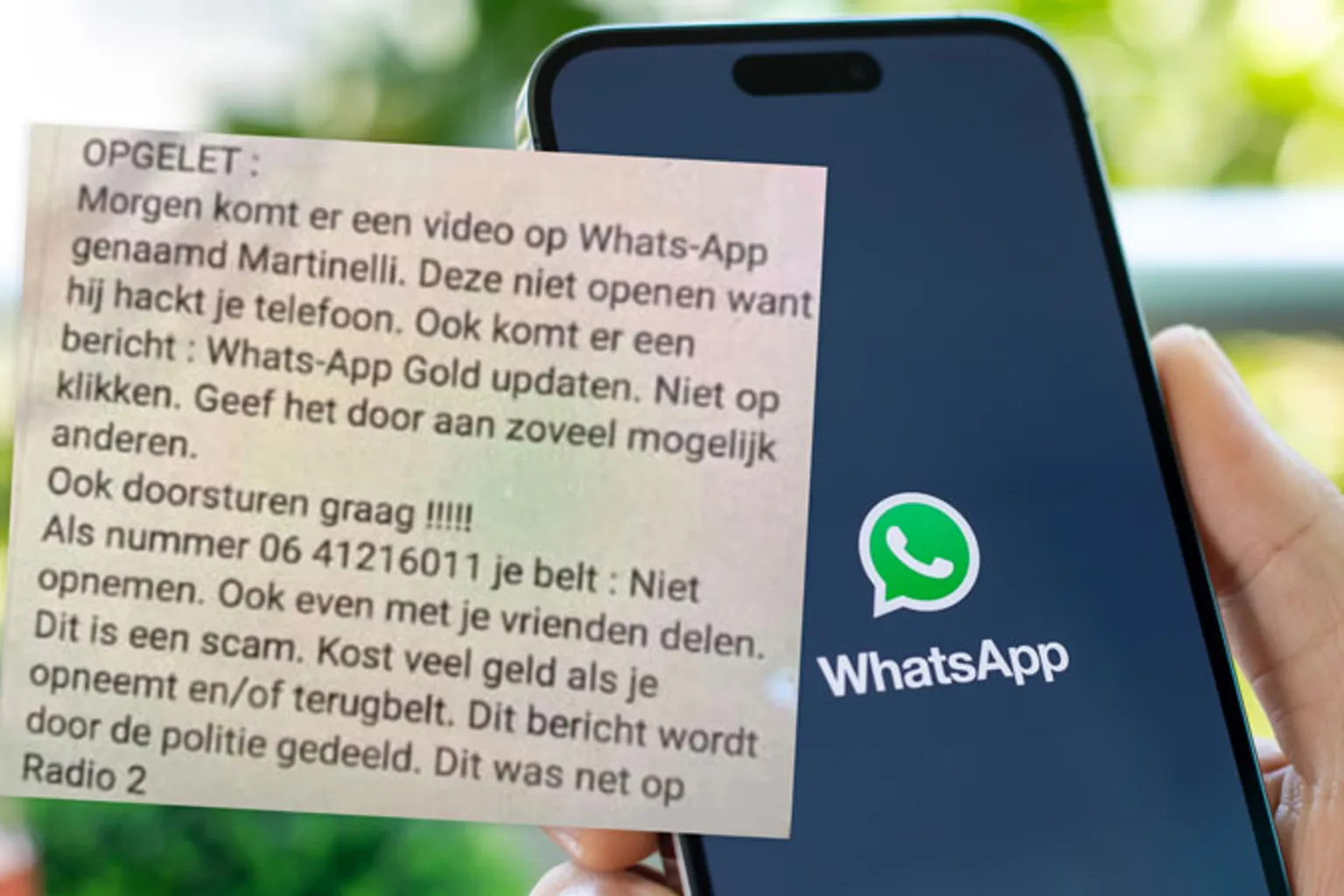 Morgen komt er een video op Whats-App genaamd Martinelli. Deze niet openen want hij hackt je telefoon. Ook komt er een bericht: Whats-App Gold updaten. Niet op klikken. Geef het door aan zoveel mogelijk anderen. Ook doorsturen graag !!!!! Als nummer 06 4126011 je belt: Niet opnemen. Ook even met je vrienden delen. Dit is een scam. Kost veel geld als je opneemt en/of terugbelt. Dit bericht wordt door de politie gedeeld. Dit was net op Radio 2