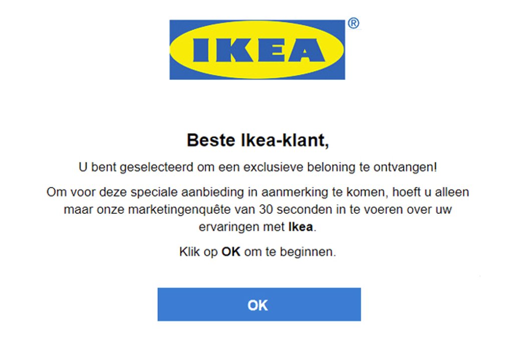 'Best Ikea-klant, u bent geselecteerd om een exclusieve beloning te ontvangen.' Dat is goed nieuws zou je denken. Maar pas op, dit is een phishingmail.
